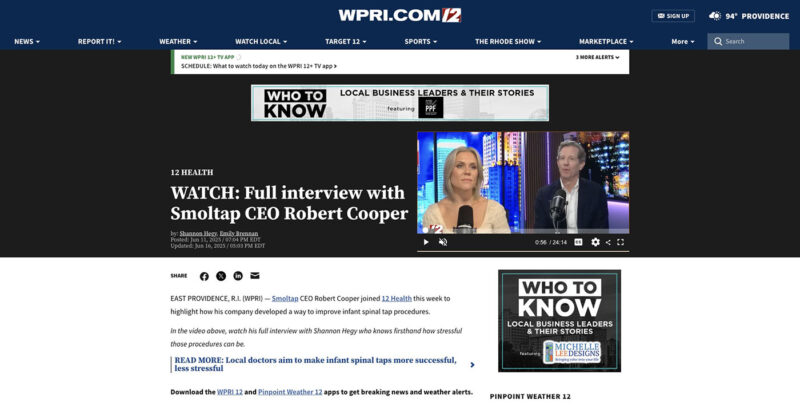 Watch the Full Interview: To learn more about Smoltap’s innovative approach to infant spinal taps and hear directly from CEO Robert Cooper about the company’s mission and technology, read the complete WPRI 12 Health interview coverage.
